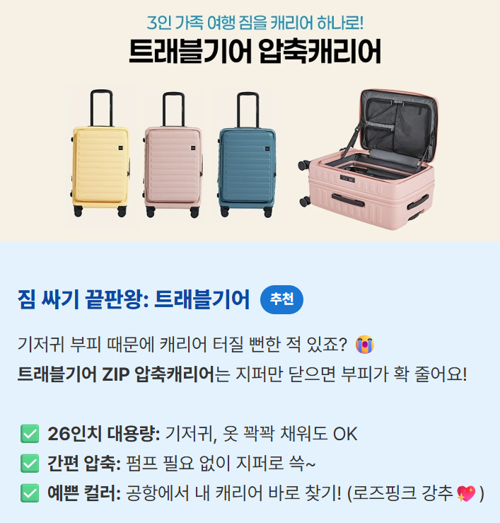 안녕하세요, 여행의 편안함을 전달하는 여행용품 브랜드 ‘트래블기어’ 담당자입니다.