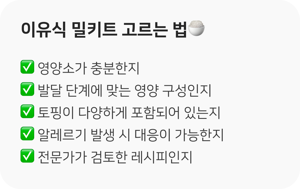 이유식 밀키트를 선택할 때에는 아래와 같은 체크리스트를 확인해 보면 좋아요.