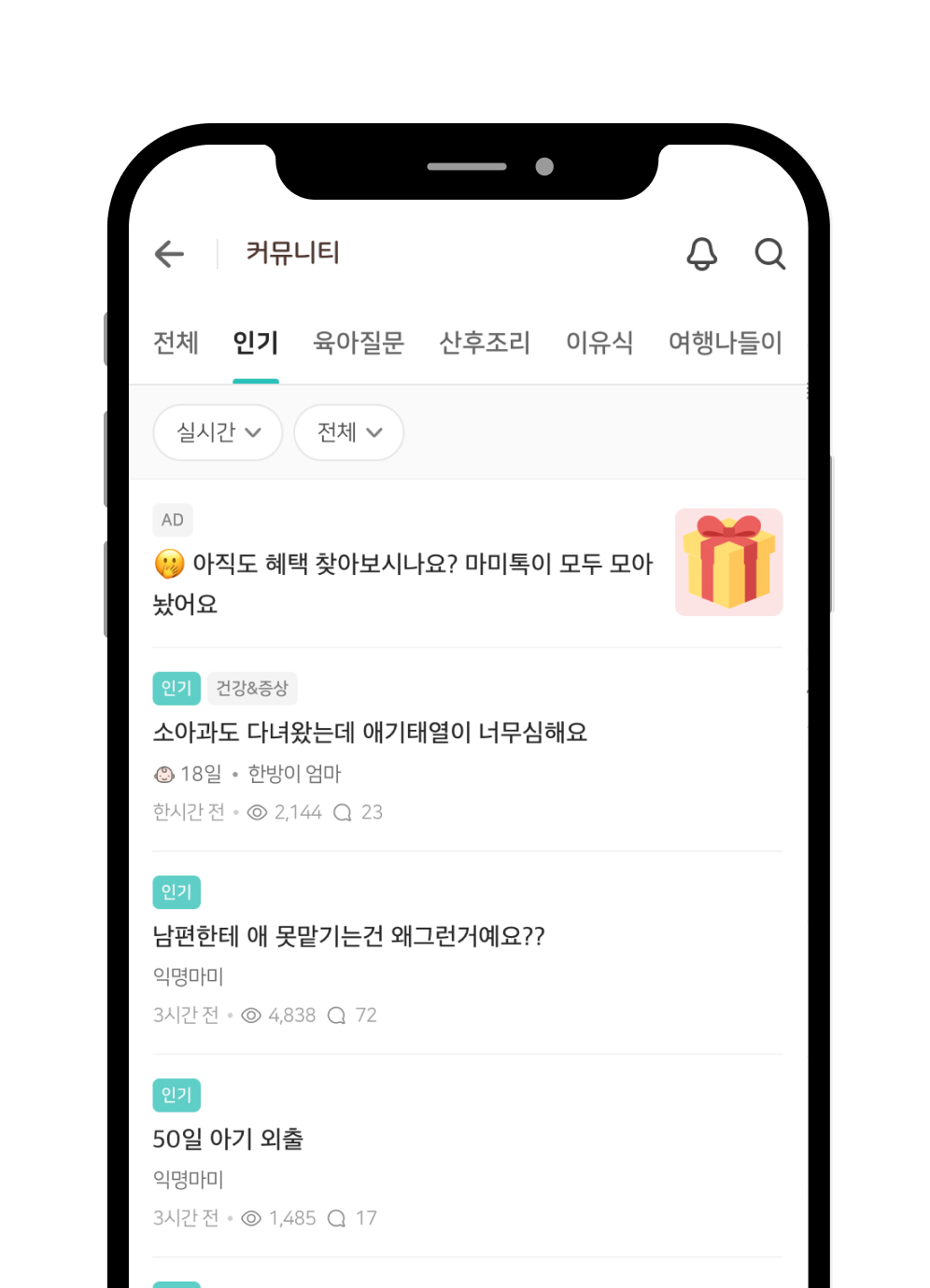 많이 기다리셨죠? 마미톡 유저들이 격하게 반응한 인기 게시글만 모아진 인기 게시판이 드디어 생겼어요. 인기글은 매시간 업데이트되니 자주자주 들어오셔서 핫이슈🔥 놓치지 마세요!