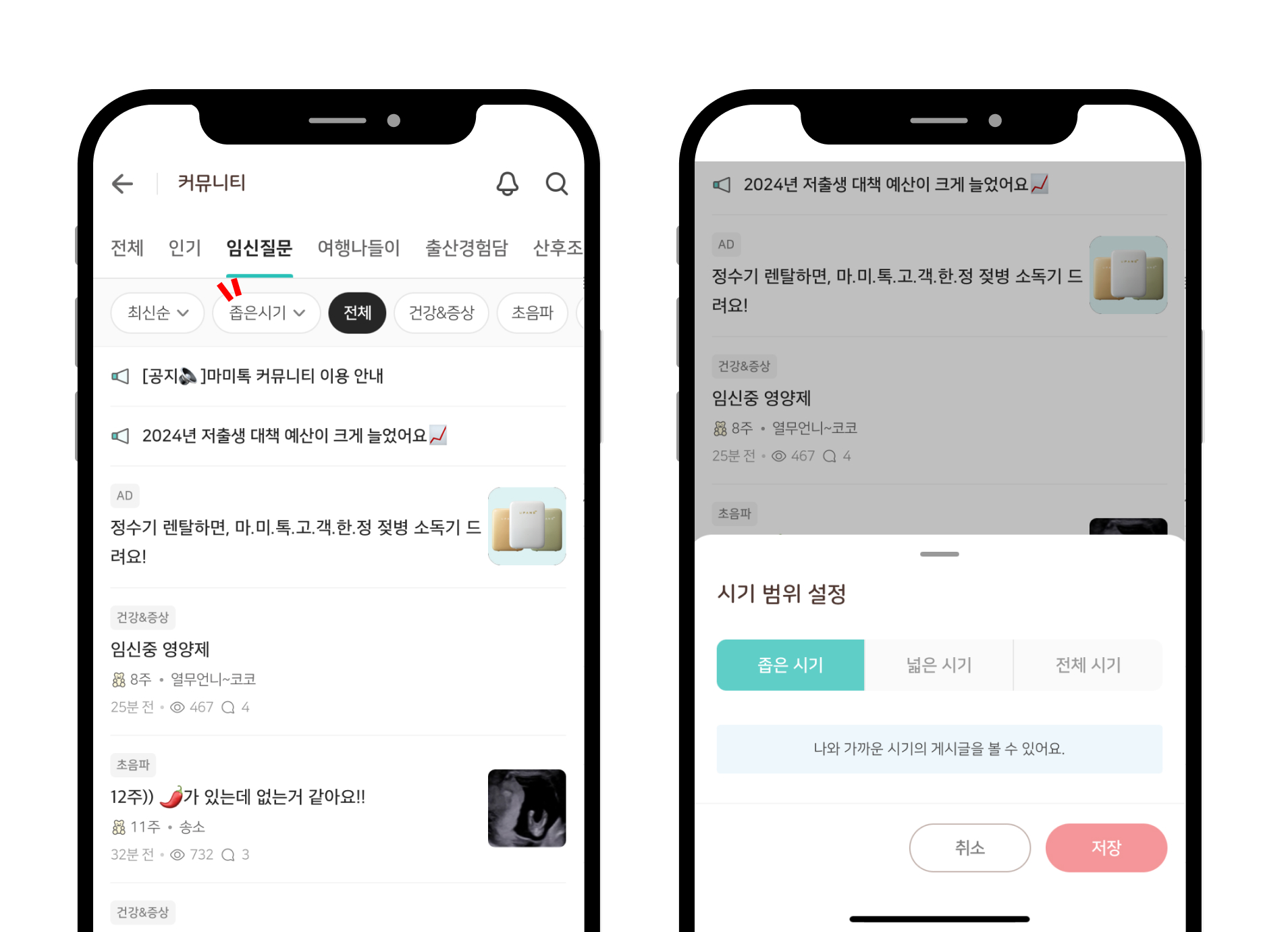 시기 필터 설정하면 원하는 시기의 게시글들만 모아서 볼 수 있어요. 좁은 시기를 설정하면 나와 가까운 시기의 게시글만, 넓은 시기를 설정하면 나와 조금 먼 시기의 게시글까지, 전체 시기를 설정하면 모든 게시글을 볼 수 있어요.